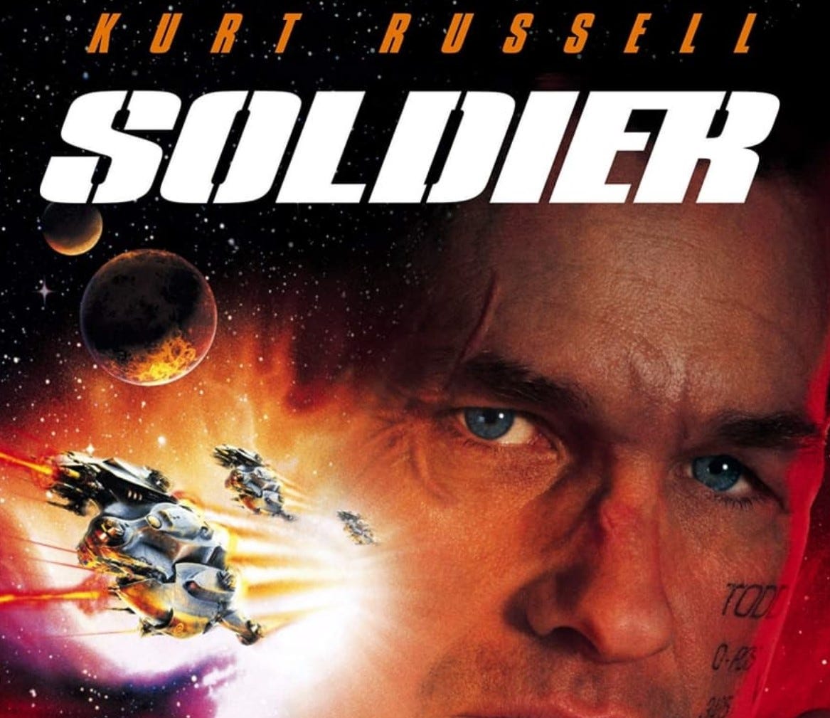 I recently watched the less popular (but unintentionally hilarious) Kurt Russell 1996 film, Soldier (set in 2036). If you haven’t seen it, deadpan Kurt Russell plays a soldier left for dead on a waste disposal planet where he befriends and protects refugees from ‘his former superiors who are determined to eliminate them’.